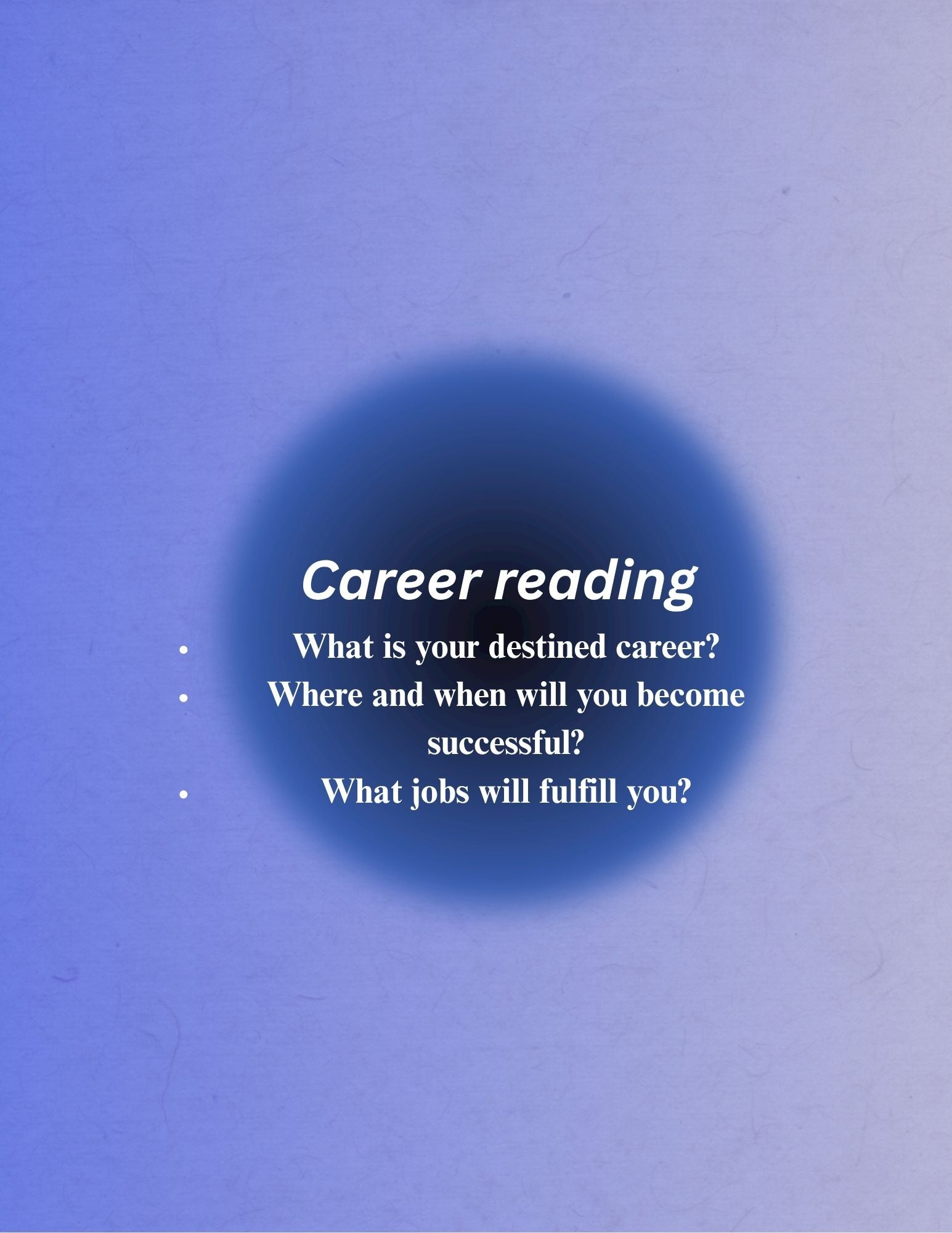 A few page PDF reading discussing what's the ideal career choice for you, what would you be doing professionally, in what field will you find the most luck and happiness, when and where will you become successful, in what country would you thrive the most in, will you be moving for your job and so much more!